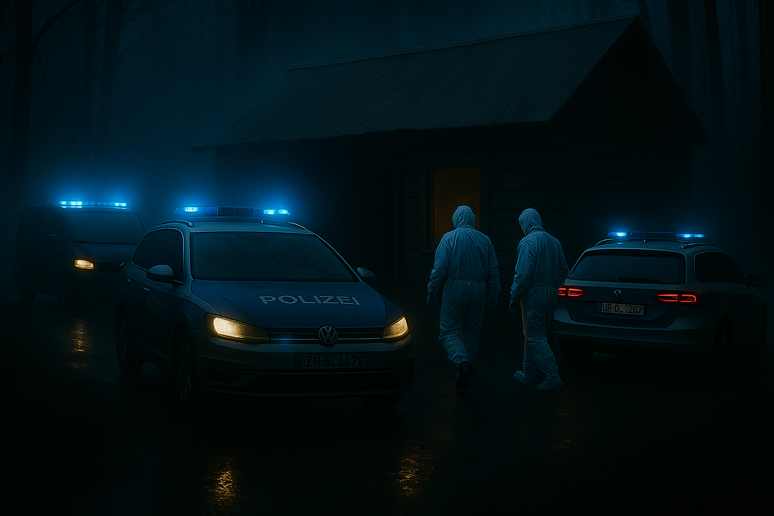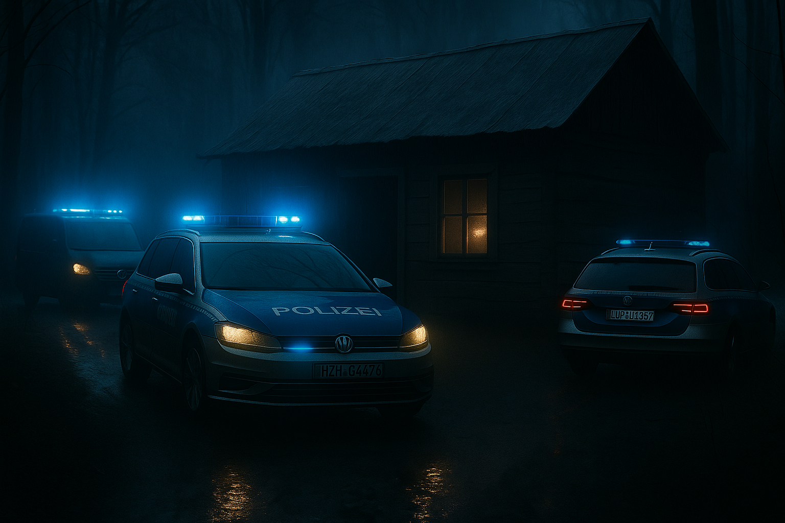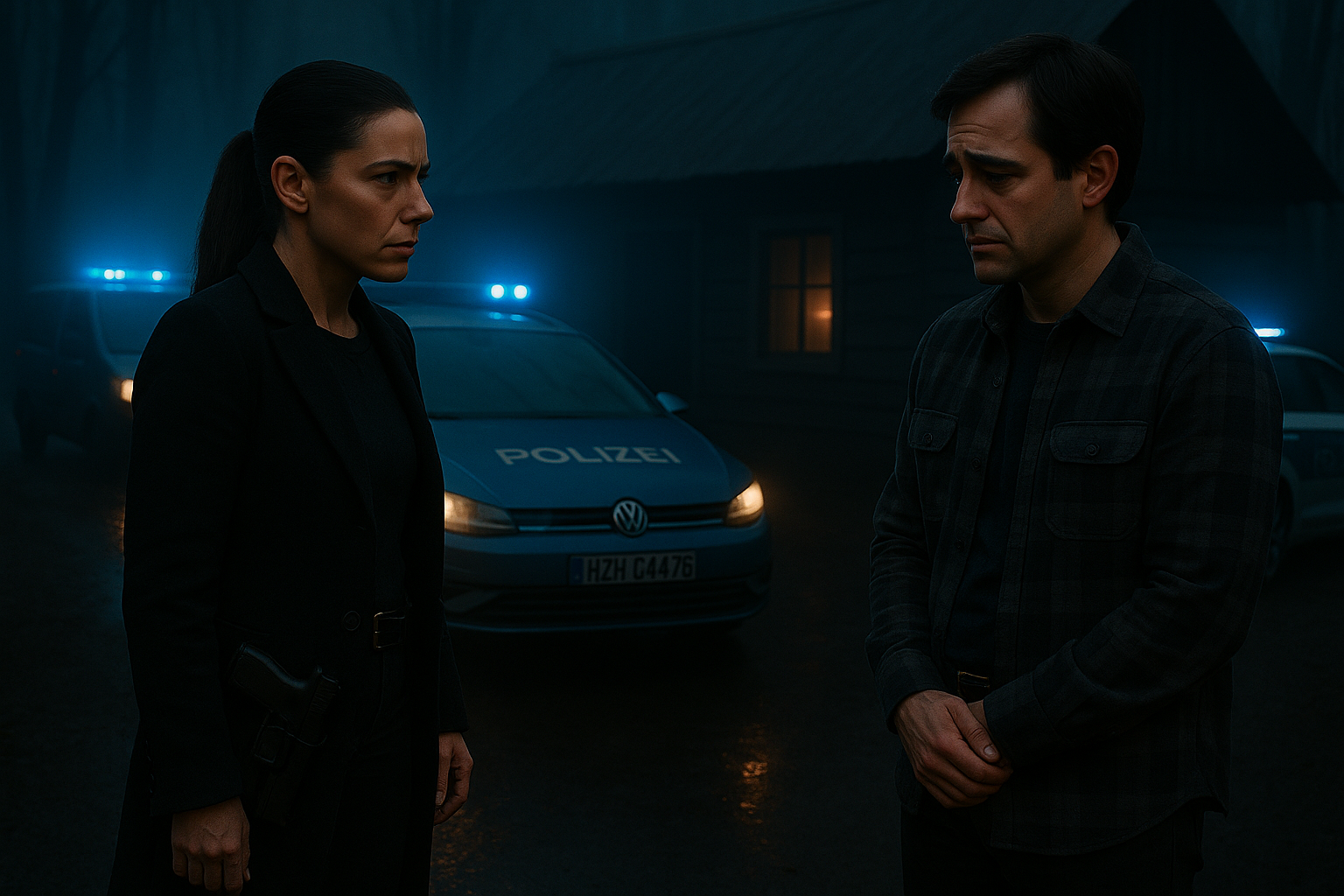 Zwei Streifenwagen kamen über den schlammigen Waldweg, gefolgt von einem dunklen Transporter der Spurensicherung. Blaulicht flackerte zwischen den kahlen Ästen, während feiner Nieselregen auf die Motorhauben tropfte.