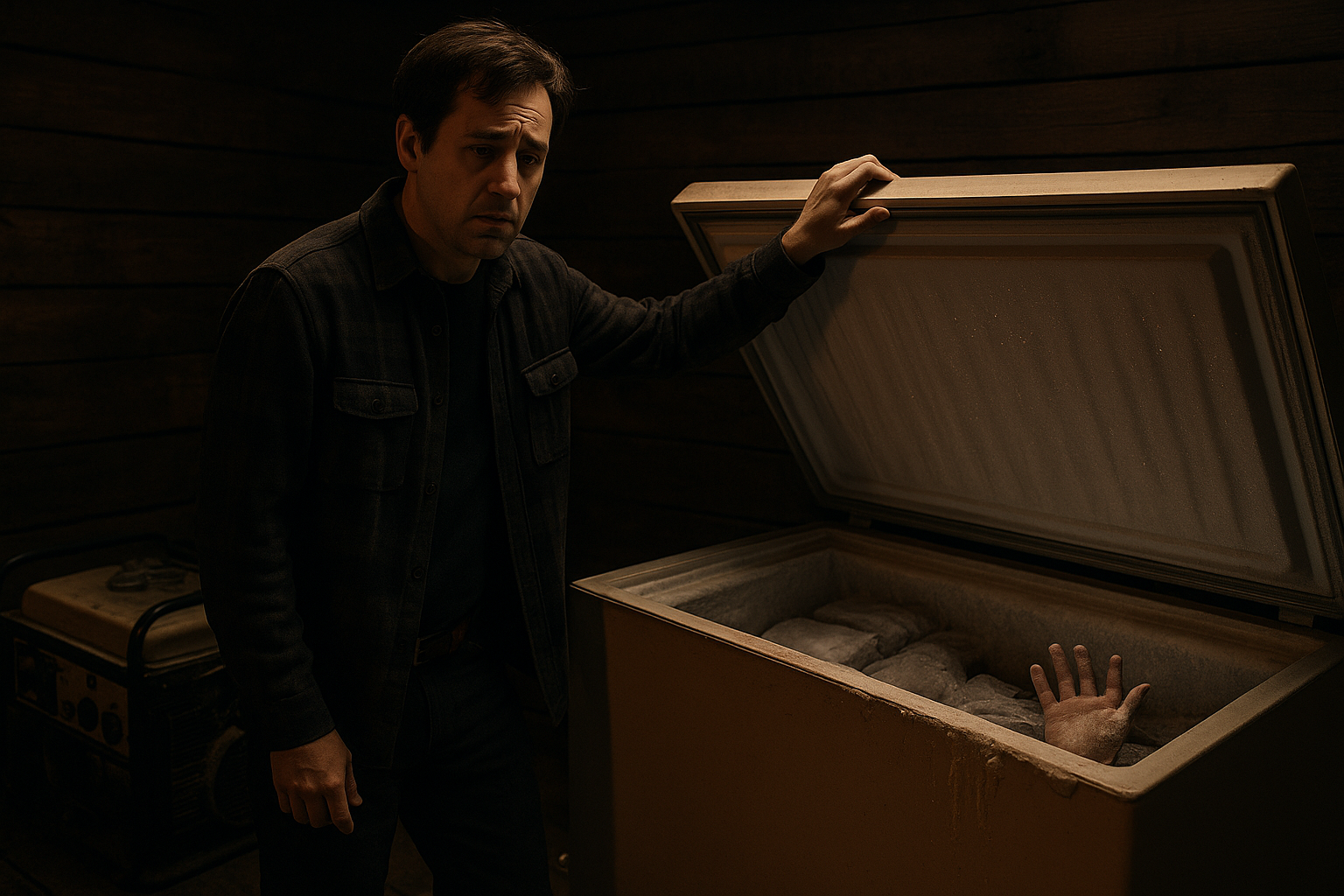 In der Ecke brummte leise ein alter Stromgenerator, der das Licht im Raum speiste. Daneben – eine große weiße Gefriertruhe. Der Deckel war halb angelehnt, und auf dem Metall sammelte sich Raureif. Thomas trat näher, zögernd, die Hand an der Kante. Ein unruhiges Pochen breitete sich in seinem Hals aus.
