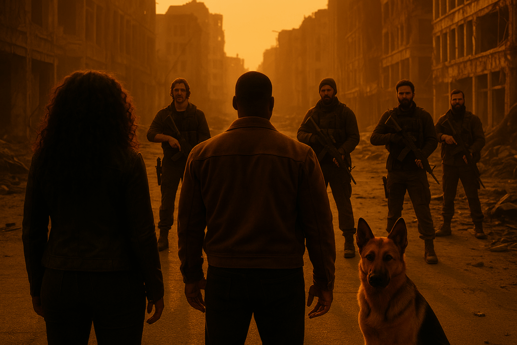 Im nächsten Moment krachte ein Schuss. Die Kugel schlug nur wenige Zentimeter von James’ Kopf entfernt in die Wand. Rex sprang knurrend vor, das Fell gesträubt. Aus den Ruinen traten vier Männer, schwer bewaffnet, ihre Gesichter hart, gezeichnet von Hunger und Gewalt.