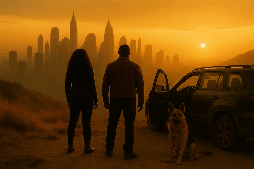 Sie hielten am Rand der Stadt, wo der Asphalt in staubige Erde überging. Vor ihnen erhob sich die Skyline im roten Licht des Sonnenuntergangs. Türme, halb zerstört, aber immer noch stolz, ragten in den Himmel.