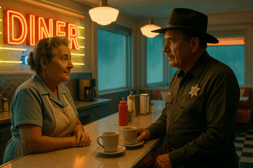Drinnen hinter dem Tresen stand Mabel, wie immer mit hochgestecktem Haar und einer Schürze, die aussah, als hätte sie seit Reagan kein Update bekommen.