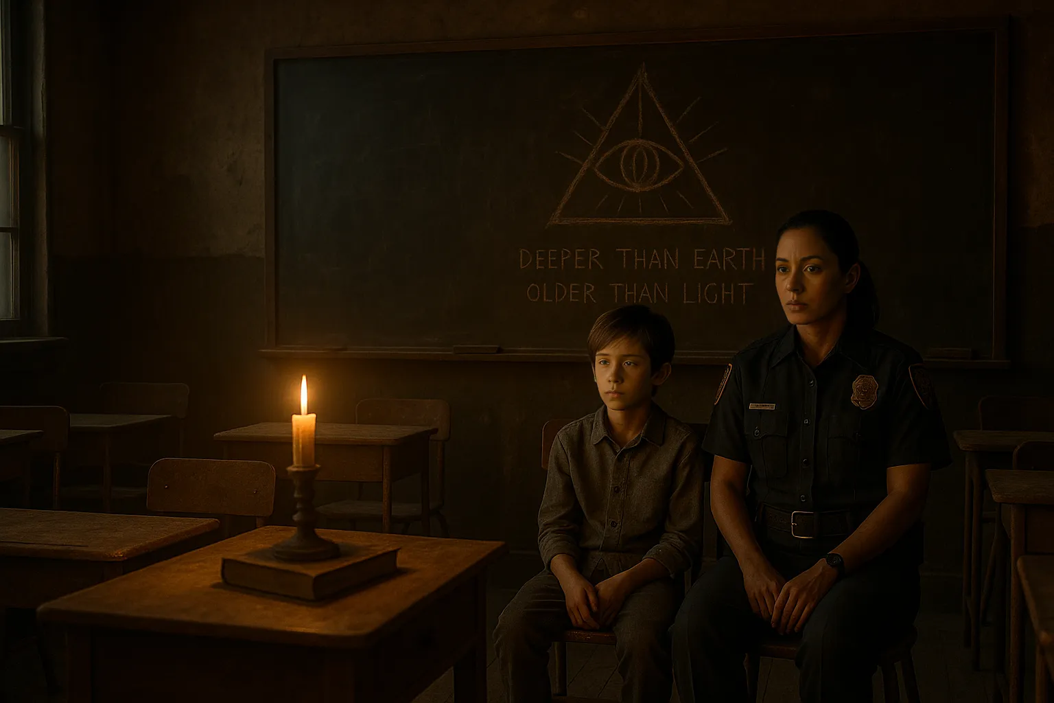 Die Wände um sie herum waren von Symbolen überzogen – dieselben Spiralen wie an der Tafel, aber älter, tiefer, leuchtend. Und zwischen den Linien lagen Dinge, die wie Gesichter aussahen. Menschliche Gesichter, eingefangen im Gestein, die Augen geöffnet, als würden sie schlafen.