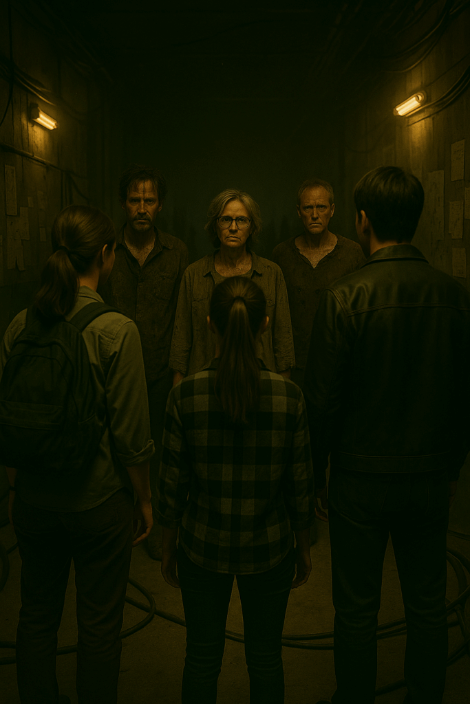 Bevor Lena antworten konnte, hörten sie Schritte. Drei Gestalten traten aus dem Schatten – Überlebende in zerrissene Kleidungen.